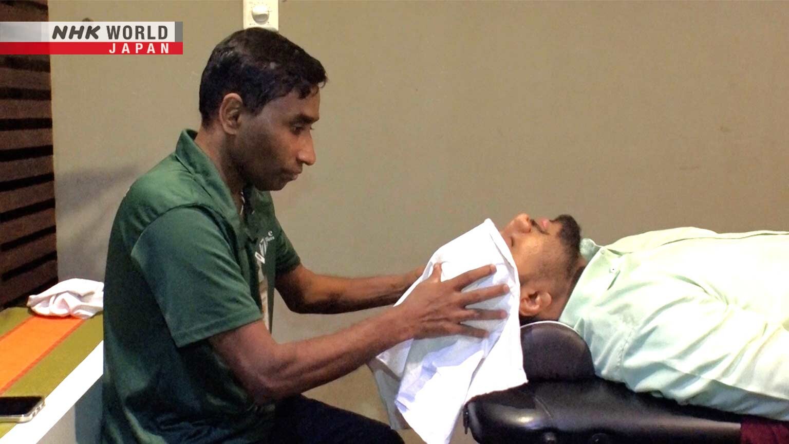 A visually impaired man with almost no work opportunities now earns a high income through Japanese-style massage.