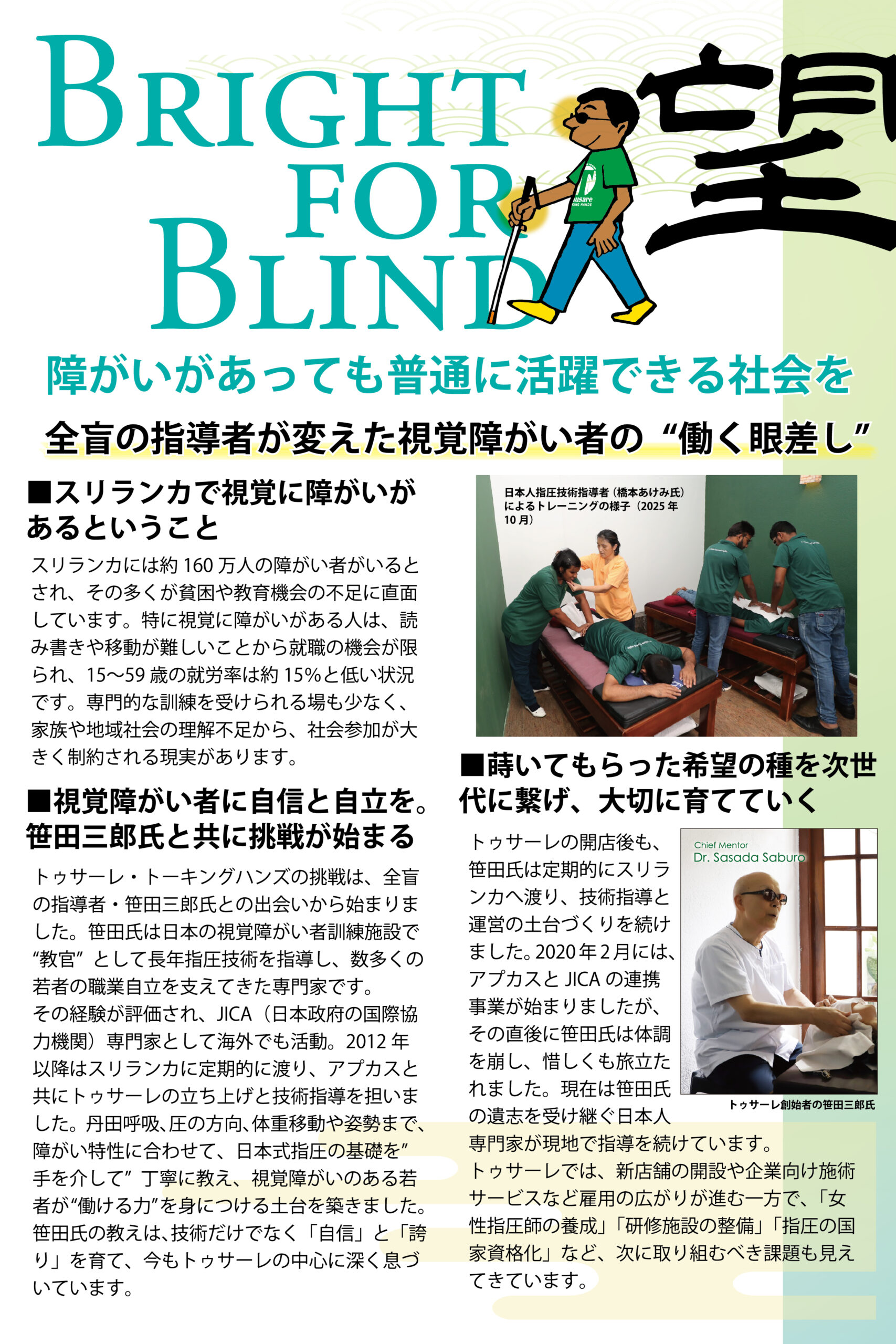 トゥサーレの歩みや笹田先生の挑戦、視覚に障がいのある人たちが誇りを持って働ける場づくりへの挑戦を、写真やエピソードを通して感じていただける内容です。