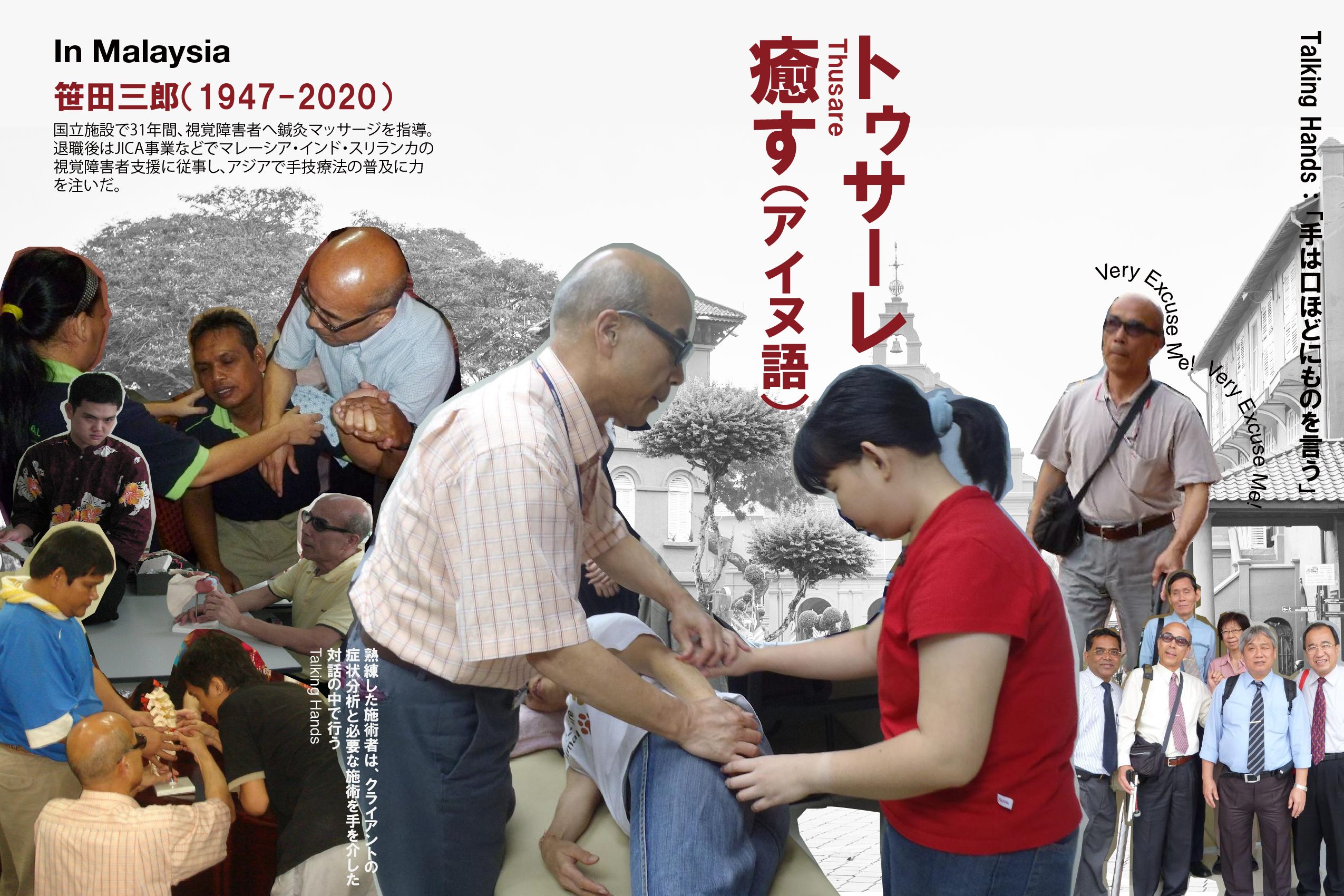 デザイナーの谷本天志さんに10年ほど前にデザインいただいたオリジナルパネルをベースに、トゥサーレの活動の10年余の歩みと笹田先生のご活躍をパネルにしました。トゥサーレの指圧師たち自身の成長も感じるパネルに仕上がりました。また、2025年に長期に渡り、現地で指圧指導を行っていただいている橋本あけみ氏を含む最新のトゥサーレの写真も掲載しました。